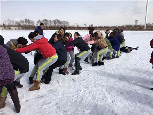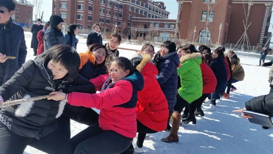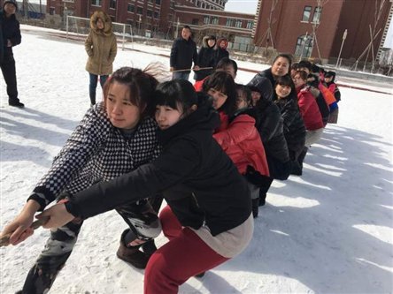 为庆祝三·八国际劳动妇女节,哈美加外校校工会利用3月8日、9日两天的午休时间,在校体育场举办了全校女教职工雪地拔河比赛。