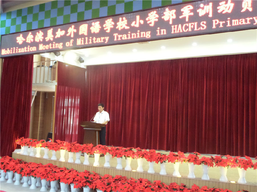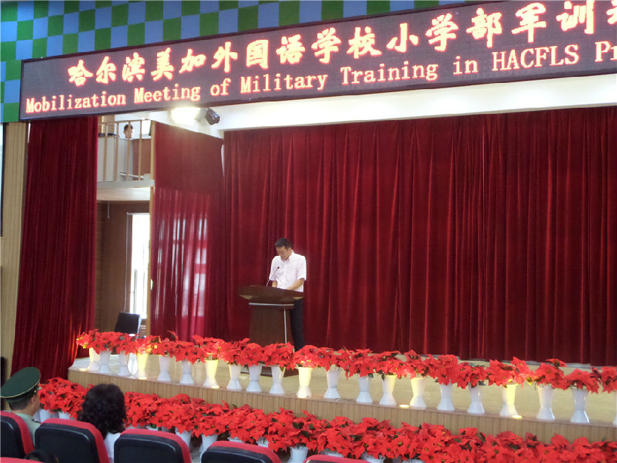 8月26日9点,哈美加外校小学部五年级全体师生和家长在报告厅召开军训动员大会。张彦校长为同学们奏响毕业班“开学第一课”的序曲。五年级军训是哈美加外校小学部建校以来的创举,首开哈尔滨市小学生军训的先河,建校两年来收到了良好的社会反响。军训,是师生亲密交流、增进理解的桥梁;是学生领悟亲情,感恩父母的体验之旅;更是独立自强、乐观成长的捷径。