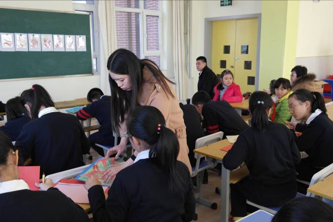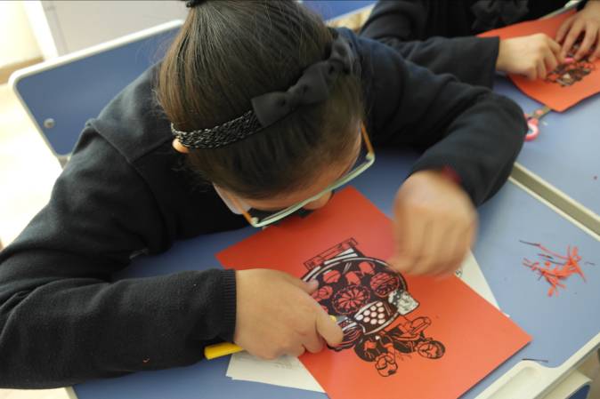 学生在剪纸课上