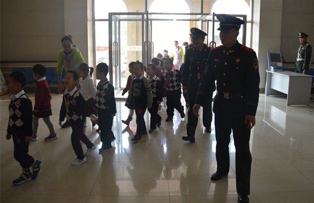 在消防官兵的引导下,孩子们兴高采烈地走进了消防队。